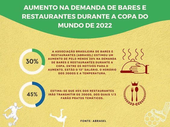 Os jogos do Brasil são as principais apostas para atrair os clientes e consumidores. Segundo estimativa da Associação Brasileira de Bares e Restaurantes, a Abrasel, houve um aumento de 30% na demanda nesses locais com os jogos da Copa do Mundo deste ano. A Abrasel explica que um dos fatores que contribuem para essa movimentação, é a liberação do 13º salário e os horários em que a seleção brasileira joga, serem no período da tarde.