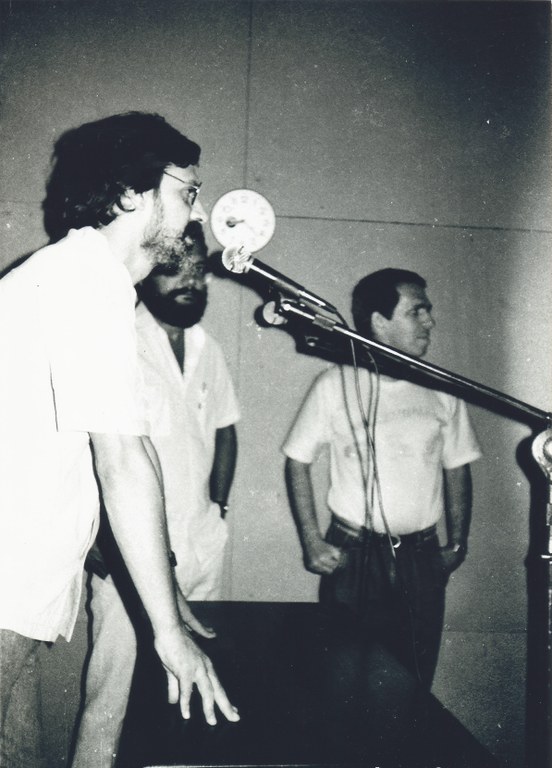 Inauguração da Rádio, em 1986, com o Prof. Guilherme Rezende (Jornalismo), Prof. Sales (Dep. Engenharia Elétrica), e o diretor da 106, Carlos Alberto de Sá Barros