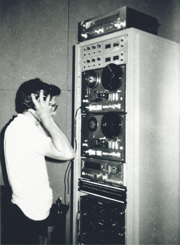 Operador de áudio, Belarmino Freire, em processo de gravação, com fitas de rolo, em 1986