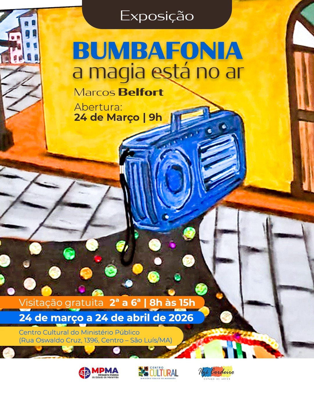Bumbafonia - a magia está no ar é a primeira exposição de Marcos Belfort no Centro Cultural do Ministério Público, composta por 28 obras, entre pinturas e esculturas, feitas a partir da reciclagem de materiais.