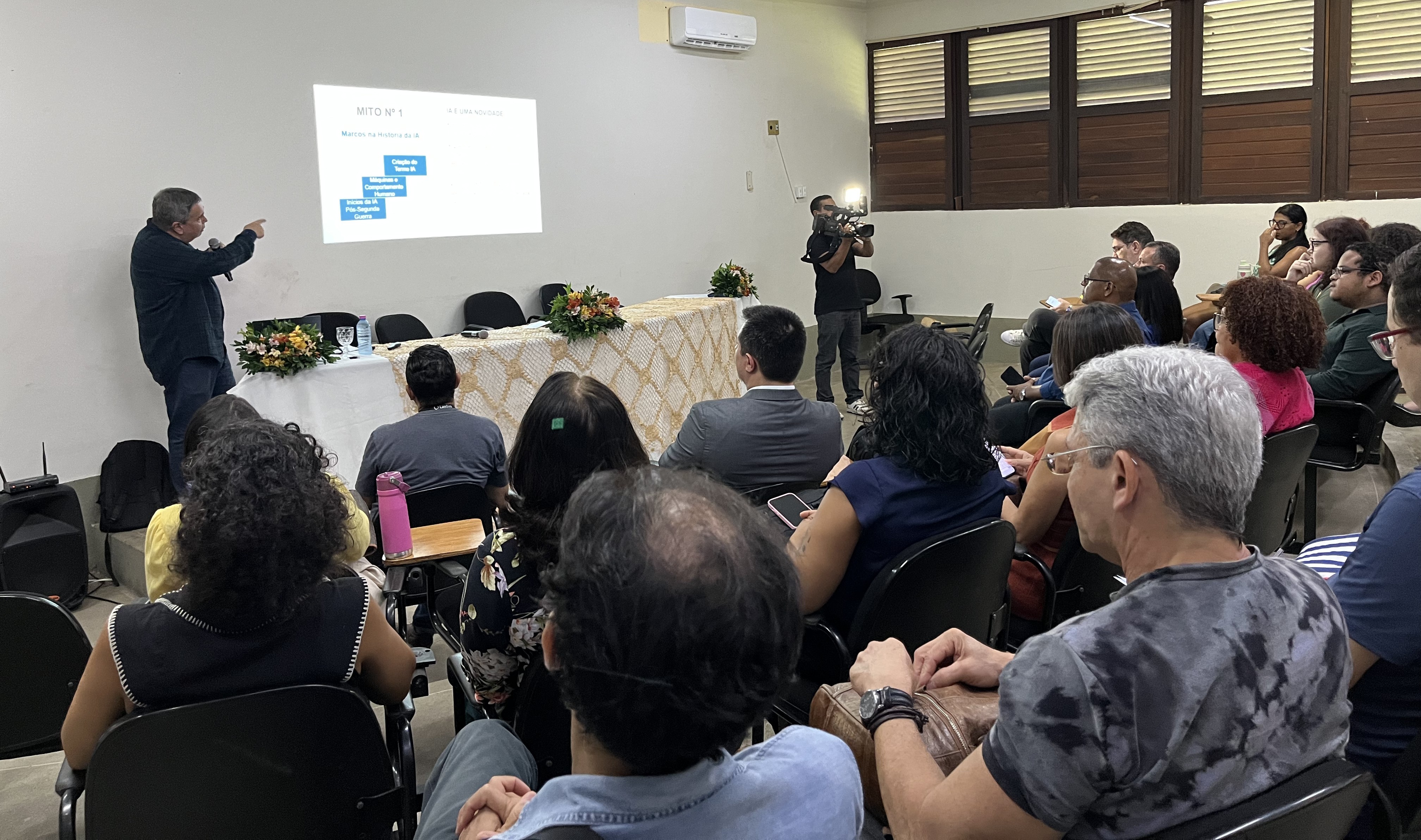 Professor do Departamento de Comunicação da UFMA, Márcio Carneiro, em palestra sobre IA na abertura do projeto