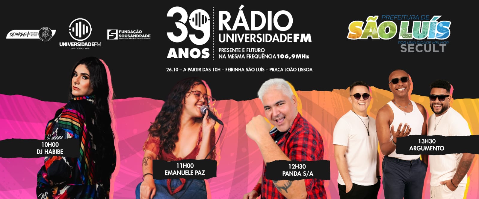 Nesta terça-feira, dia 21 de outubro, a Rádio Universidade FM (106,9 MHz) celebra 39 anos de história, reafirmando seu compromisso com a informação, cultura, educação e inovação. A data marca também o aniversário da Universidade Federal do Maranhão (UFMA), instituição à qual a emissora está vinculada, juntamente com a Fundação Sousândrade.